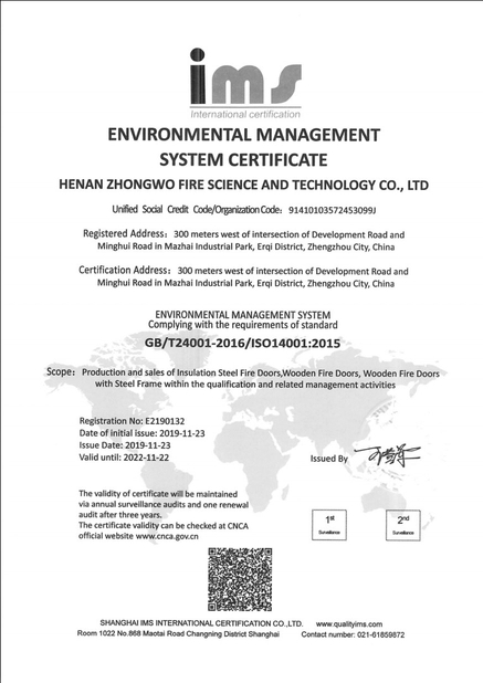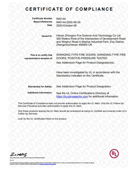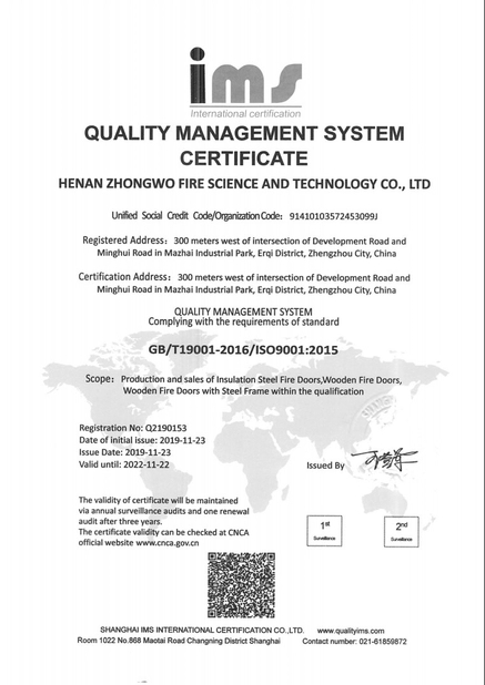 At the same time, the company has also introduced LDS-10 compression and bending universal testing machine, GDYQ-201MA formaldehyde emission detection equipment, 1.5*2.5 (m) calibration platform, LTZ-200 tube pressure gauge, FHM-II (W2.1X H2.7m) fire door reliability test device and other advanced production and testing equipment to ensure the excellent quality of fire doors.